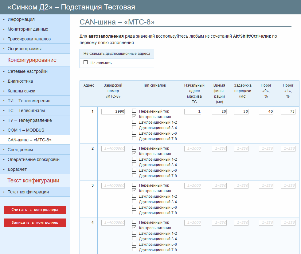 Для сохранения внесённых изменений необходимо нажать кнопку «Записать в контроллер». После сохранения конфигурации, чтобы изменения вступили в силу, необходимо произвести перезагрузку контроллера и модулей МТС, сняв питание на 30 секунд и более.