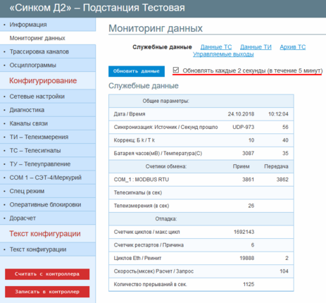 Открыть вкладку «Мониторинг данных» и установить признак «Обновлять каждые 2 секунды (в течение 5 минут)».