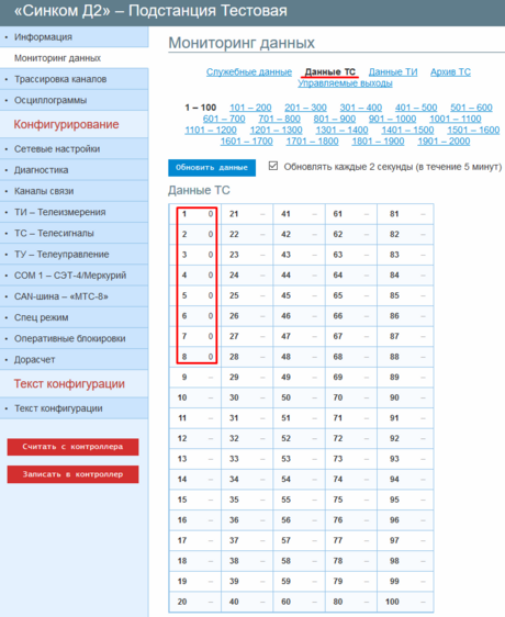 Чтобы проверить конфигурацию ТИ необходимо открыть раздел «Данные ТИ» и удостовериться что контроллер принимает ТИ согласно конфигурации.