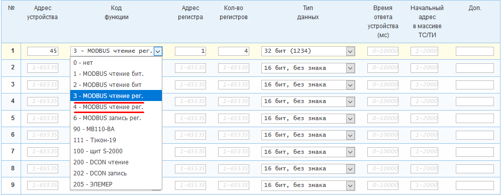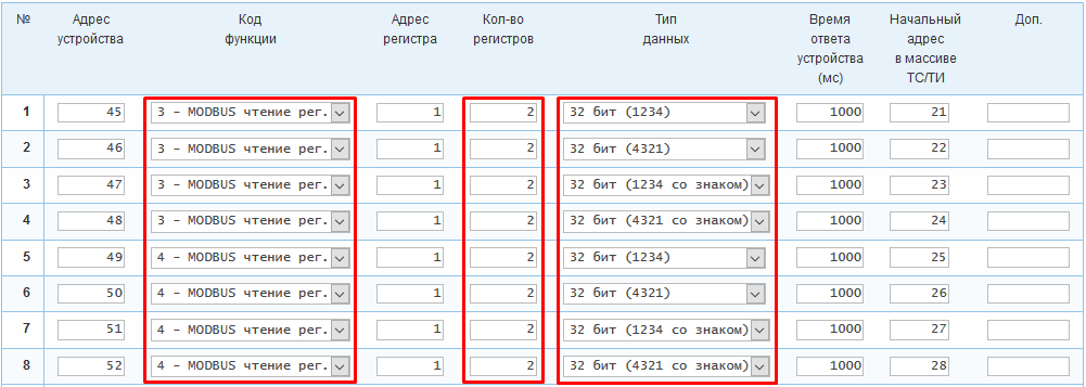 Пример: Запросы №1-4 будут выполняться по коду функции 3 к устройствам с адресами 45-48 соответственно. Запросы №5-8 будут выполняться по коду функции 4 к устройствам с адресами 49-52. Каждый запрос будет считывать 1 ТИ(32 бит) из 2 регистров начиная с регистра с адресом 1. Время ответа для каждого запроса составит 1000 мс. ТИ запросов №1, №2, №3, №4, №5, №6, №7 и №8 будут записываться в массив ТИ начиная с адресов 21, 22, 23, 24, 25, 26, 27 и 28 соответственно.