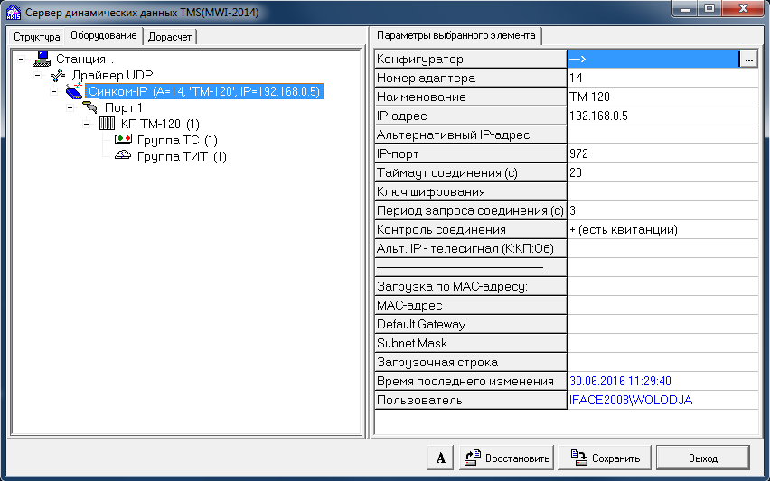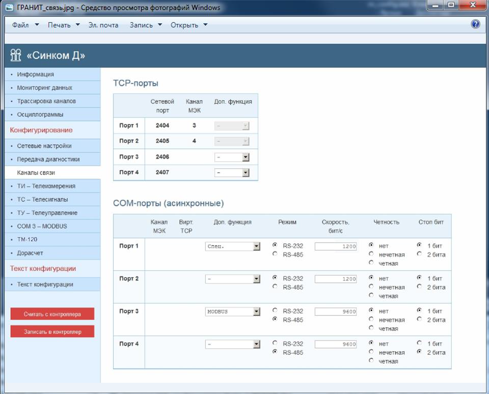 Параметры настройки протокола - «Инверсия приемника», «Инверсия передатчика», «Режим - прослушка» выбираются индивидуально с учетом настроек КП «ТМ-120». Данные, полученные через порт СОМ1, контроллер транзитом ретранслирует на порт Ethernet – UDP 972 без сохранения их в памяти контроллера.