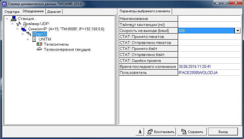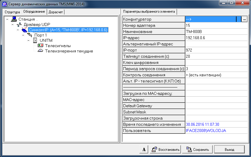 Параметры настройки протокола - «Инверсия сигнала приемника», «Инверсия сигнала передатчика», «Режим - магистральный», «Режим - подслушка» выбираются индивидуально с учетом настроек КП «ТМ-800В». Если указан признак ‘Режим Транзит’, то данные, принятые через порт СОМ1, транзитом ретранслируются на порт Ethernet – UDP 972 без сохранения их в памяти контроллера. Если признак ‘Режим Транзит’ не указан, то принятые данные (20 ТС и 16 ТИ) сохраняются в памяти контроллера по адресам, начальный адрес которых указан в параметрах ‘Адрес для приема ТС’ и ‘Адрес для приема ТИ’.