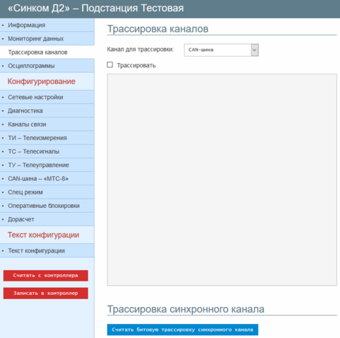 Вкладка «Трассировка каналов» позволяет сделать трассировку обмена по портам и шинам контроллера серии «Синком-Д». Также вкладка предназначена для системного мониторинга, просмотра системного журнала и журнала ТС.