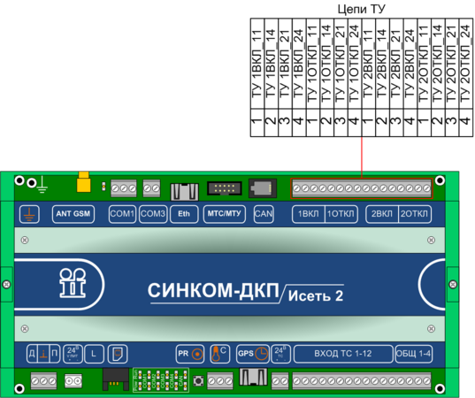 Внешние цепи ТУ подключаются непосредственно к контроллерам «Синком-ДКП» и «Синком-ДКП»/13,8. Для подключения цепей ТС используются винтовые клеммы для проводов сечением до 2,5 мм